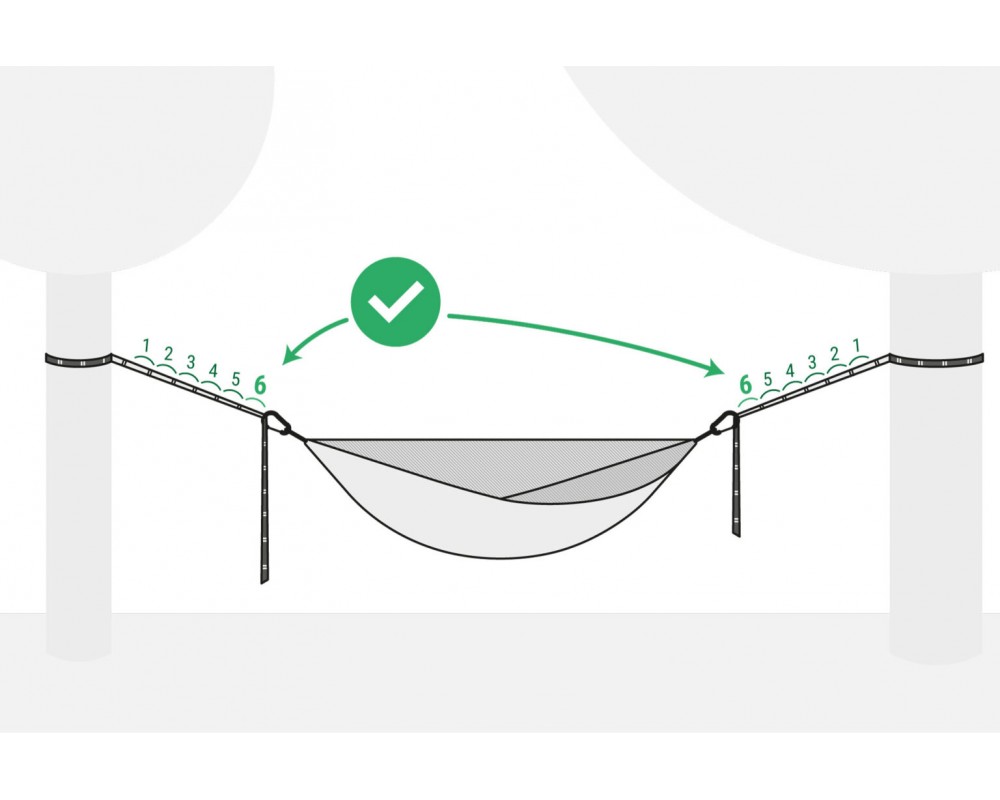 To adjust the length of the suspension, all you have to do is clip the carabiner at the end of the hammock into the desired loop on the webbing. It couldn’t be simpler. Thanks to the easy mounting on the tree and the fully adjustable length, you can adjust the hammock after it has been hung and not, as is the case with conventional ropes or webbing, by undoing the knots. Do you have a perfectionist mind? It too will be pleased, because SNEKA allows you to literally count the length of the suspension. All you have to do is clip a carabiner into the same loop on both sides of the hammock.